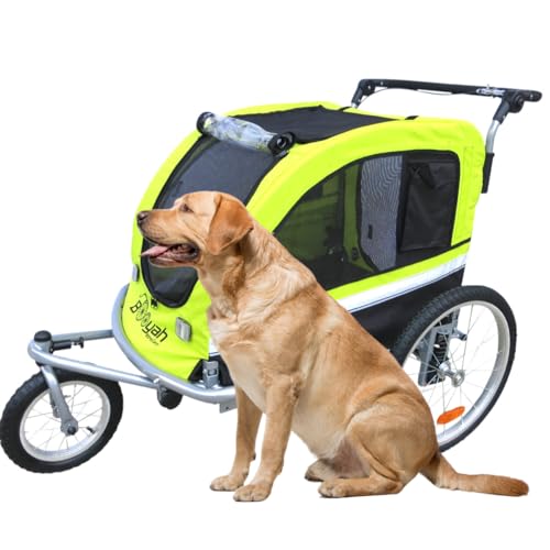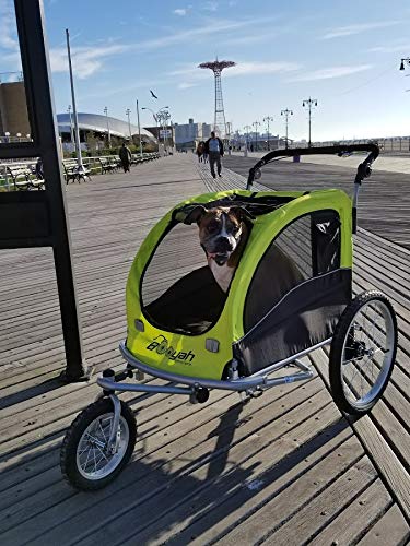 This is a non tipping stroller (wheels set back so there is not that "pop a wheelie" effect when dog enters the rear. This model has the hand brake at the handlebar. Braking system allows you to not only park but also slow down while jogging. Dimensions: Please see that your pet will fit within these inside dimensions. Inside: 32 L x 24 L x 21 H. Outside: 50 L x 34 W x 39 H