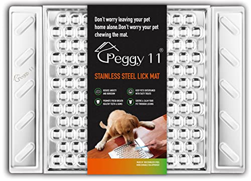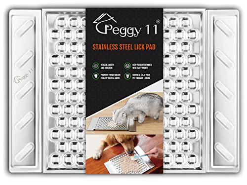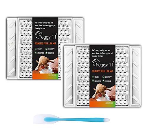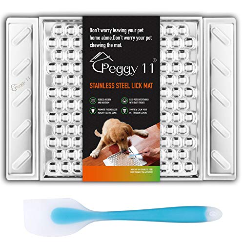 WHY CHOOSE US? Made of Food Grade 18/8 STAINLESS STEEL, Size 13.2*9.2 Inches ,Sturdier and More Durable. Ten times Stronger than Silicone(ii) More suction cups, stronger suction.Easy to Stay On The Smooth Wall and Smooth Ground(iii) Came with silicone peanut spreader. Unlike the stell spreader, silicone spreader won't damage the licking mat(iv) Non-toxic silicone and BPA free.