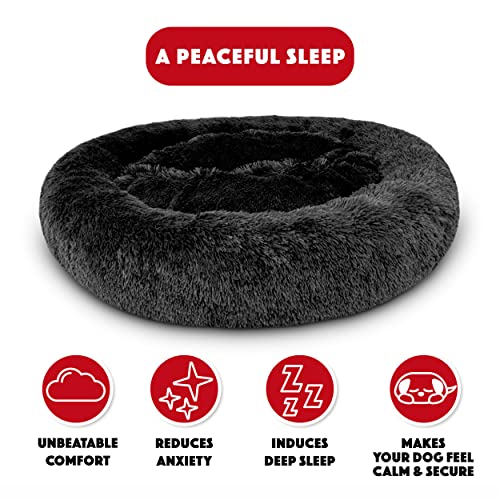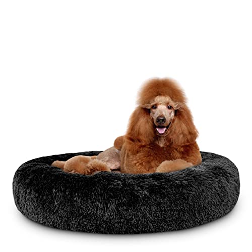 Extra Large Jet Black plush 45 inch diameter round deluxe plush dog bed. Premium 1.5 inch vegan fur contours into a deep & luxurious comforter for your cherished best friend as well as a charming room accessory, injecting style into your lounge or bedroom interior