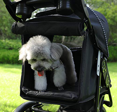 ?COMFORTABLE & SAFE PET GEAR?The luxury dog stroller provides more comfort than cheaper pet buggies - Three large zippered opening make it possible to put your pet in the stroller from both sides, back and front; The tear proof and breathable mesh windows provides airflow, visibility, and keeps insects out; Removable inner pad make your pet fell more comfortable and it is easy to clean; While strolling around in the convertible mode, the double safety leash keep your pets safe and secure.